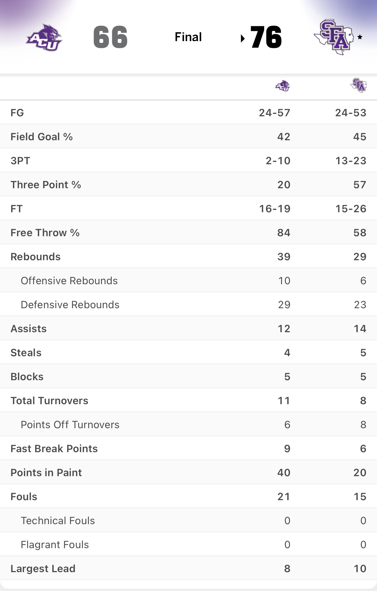 Just a simple double digit win. 76-66 SFA.