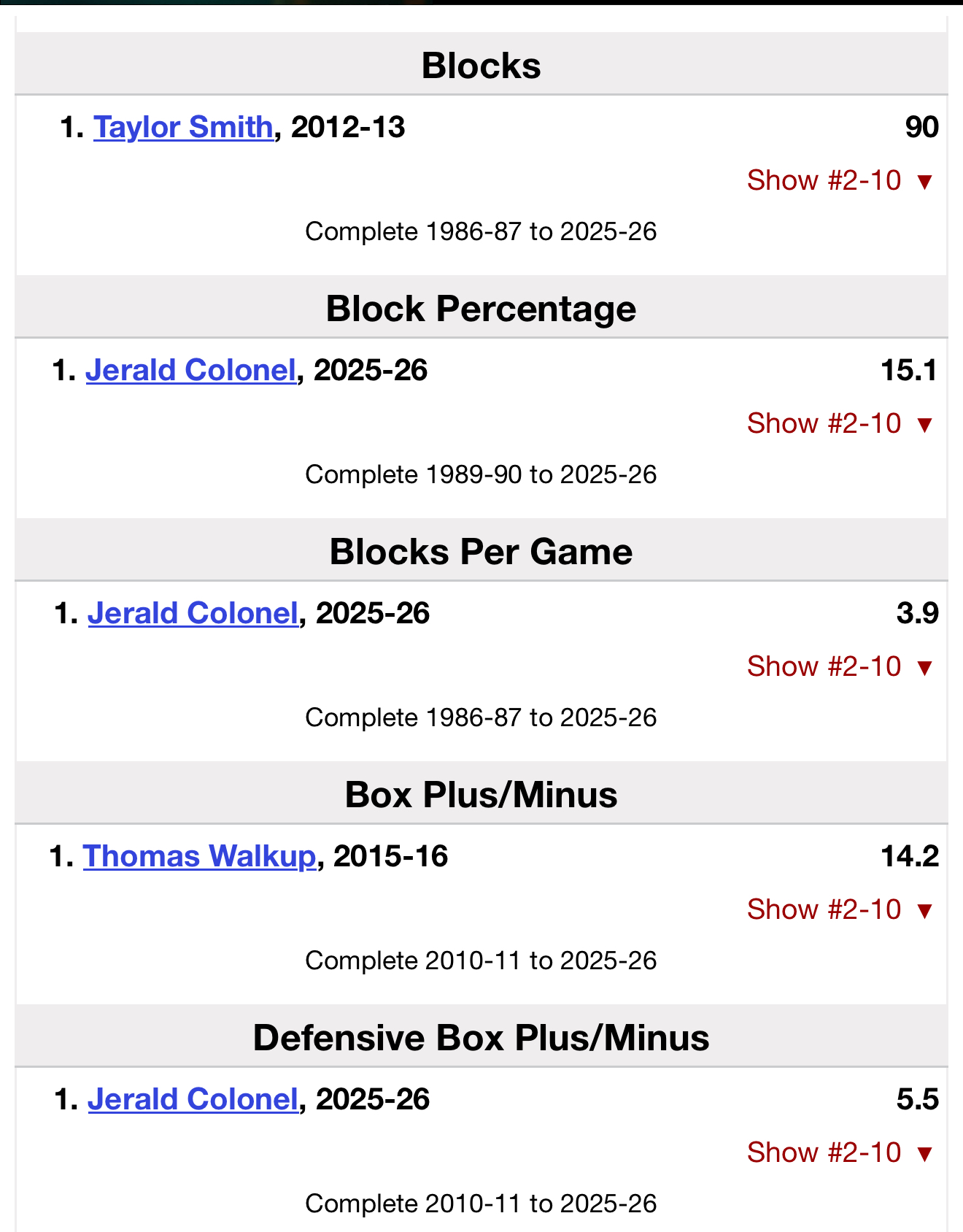 Colonel is amazing with 6 more blocks. I don't know what the school record for blocks is, but if he stays healthy that record will soon be his to keep for a very long time.