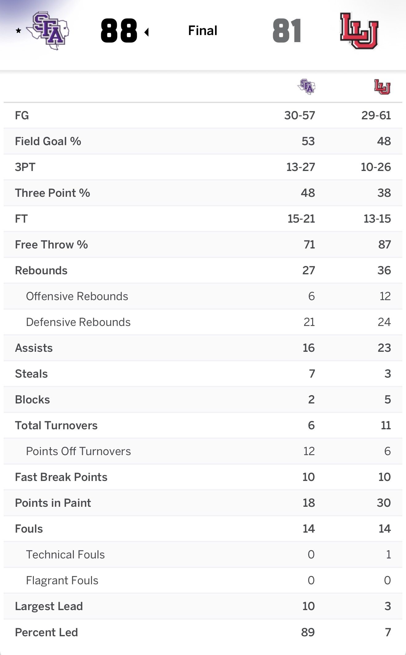 SFA (16-3, 9-1) vs. Lamar (10-9, 5-5)
