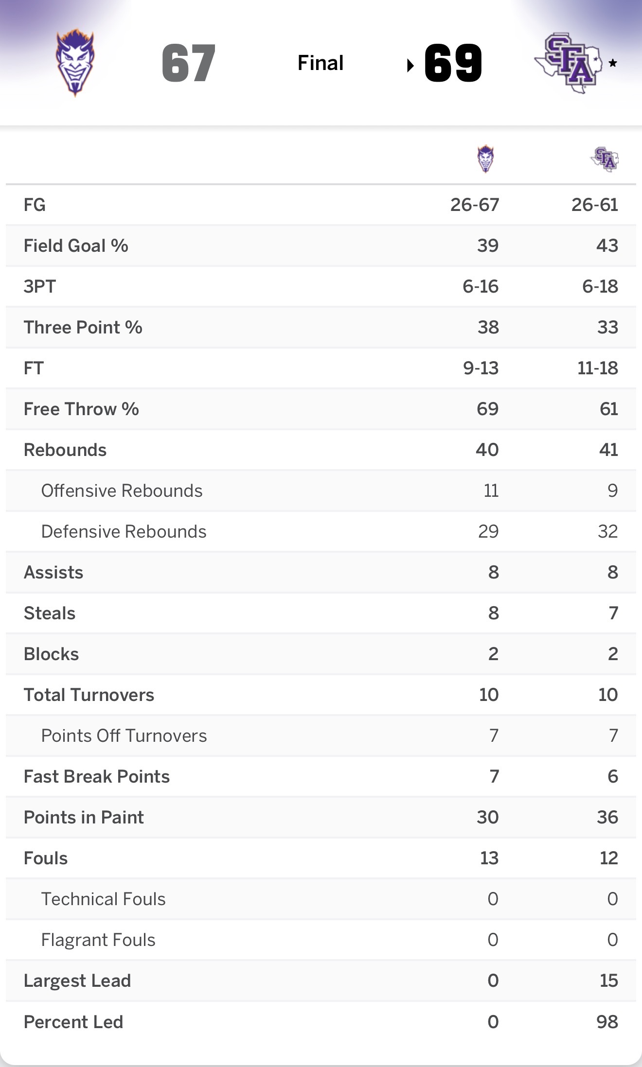 Lumberjacks win 69-67. Even if was junk down the stretch, it's a win.